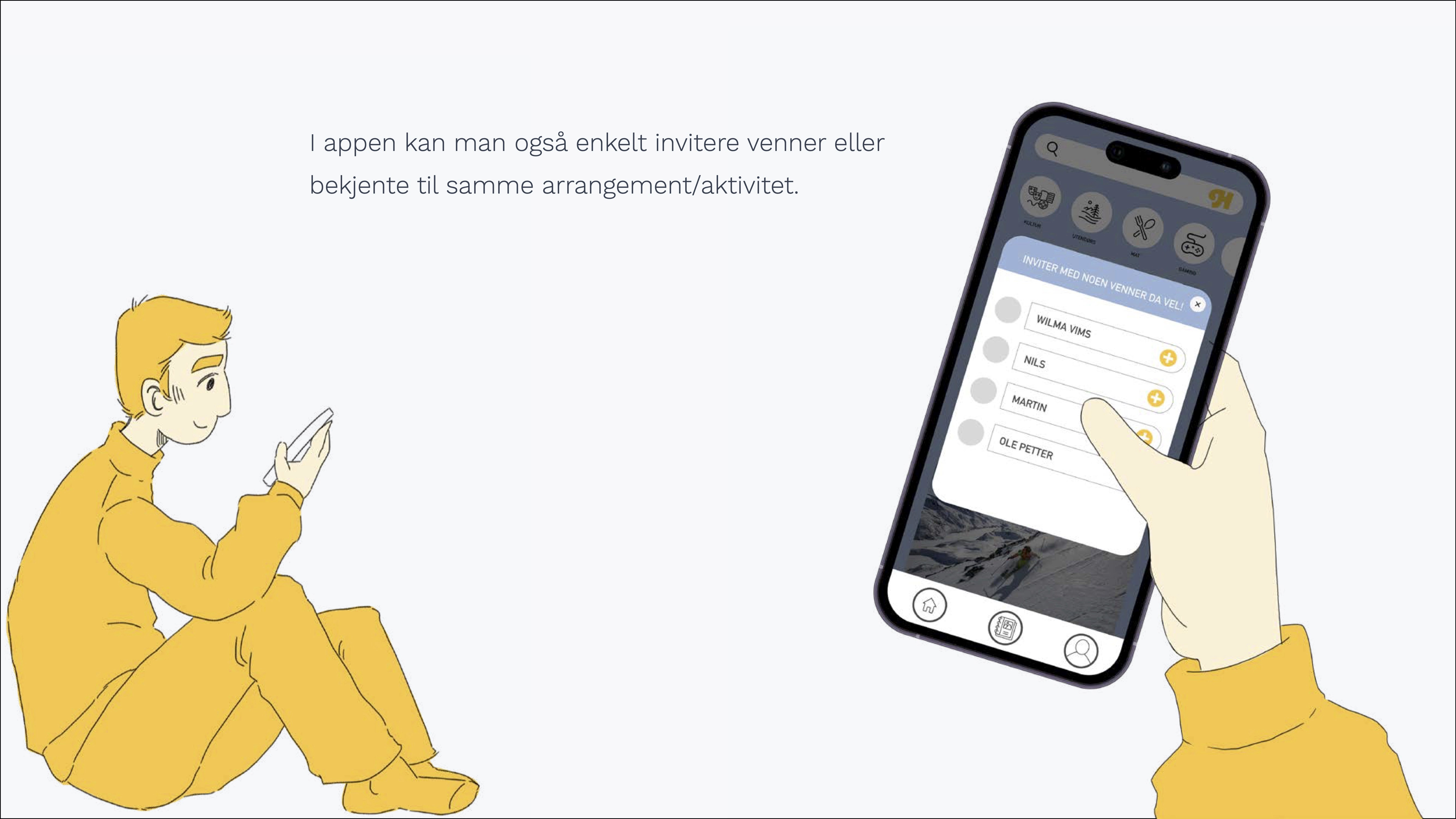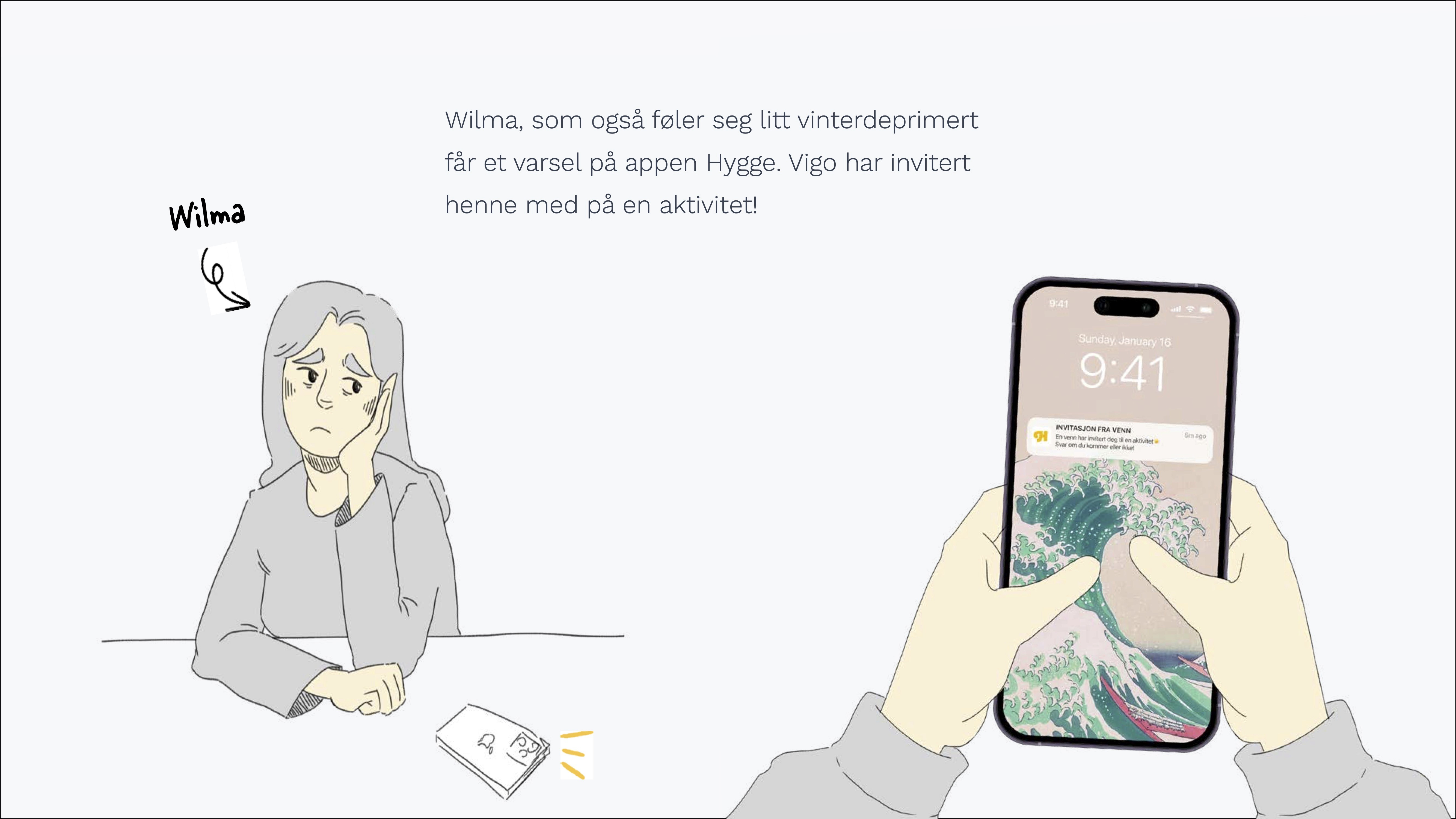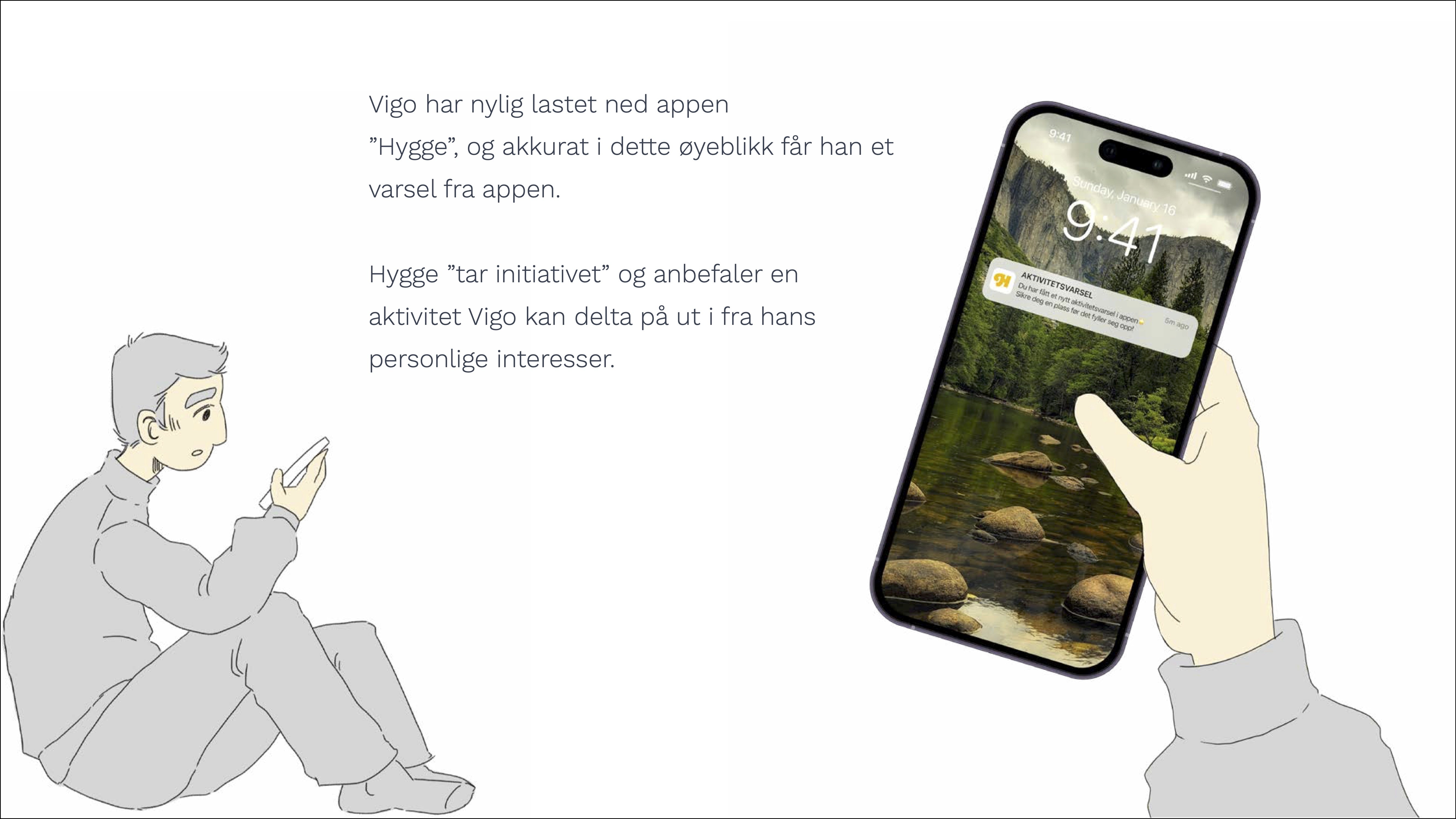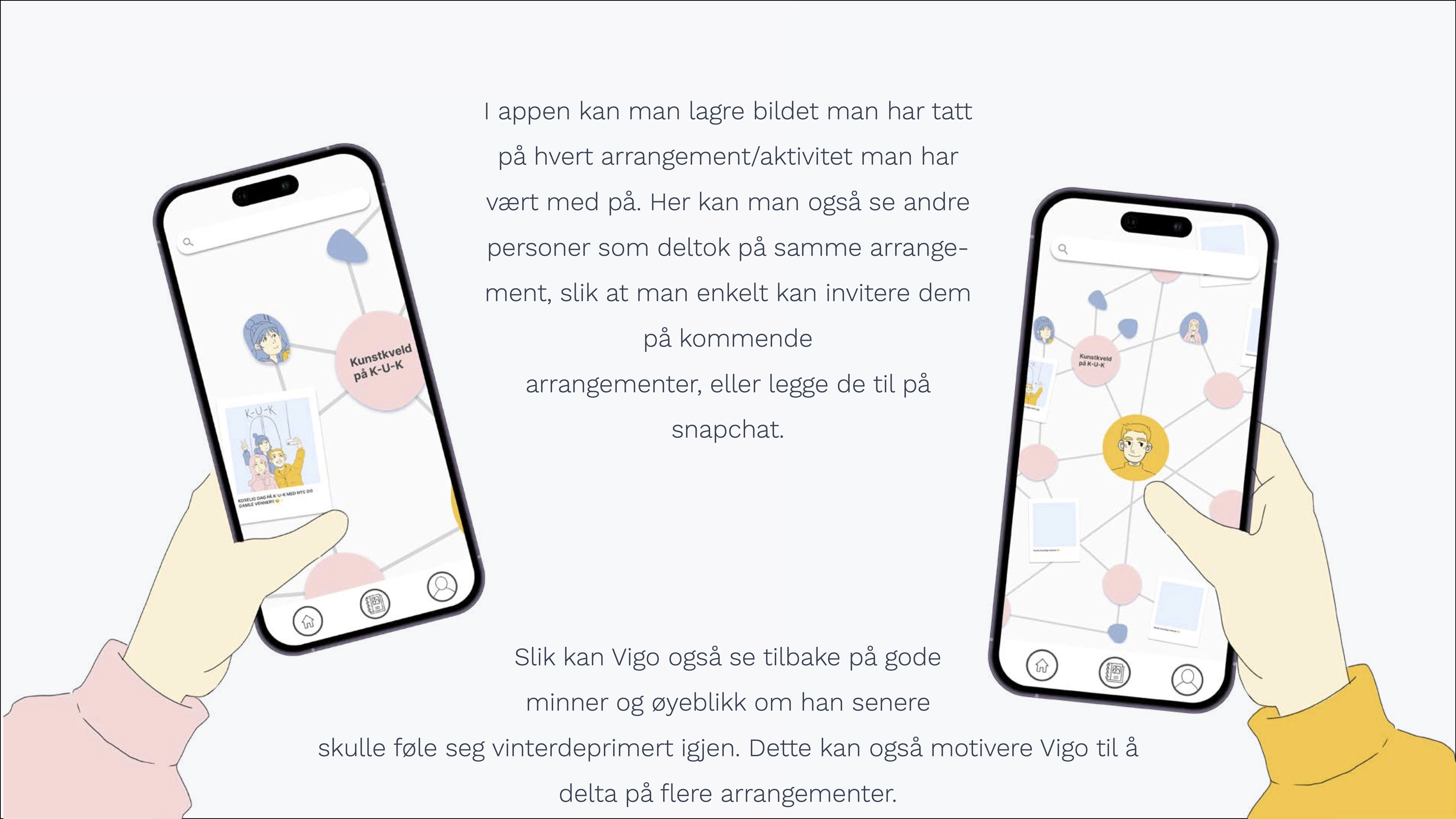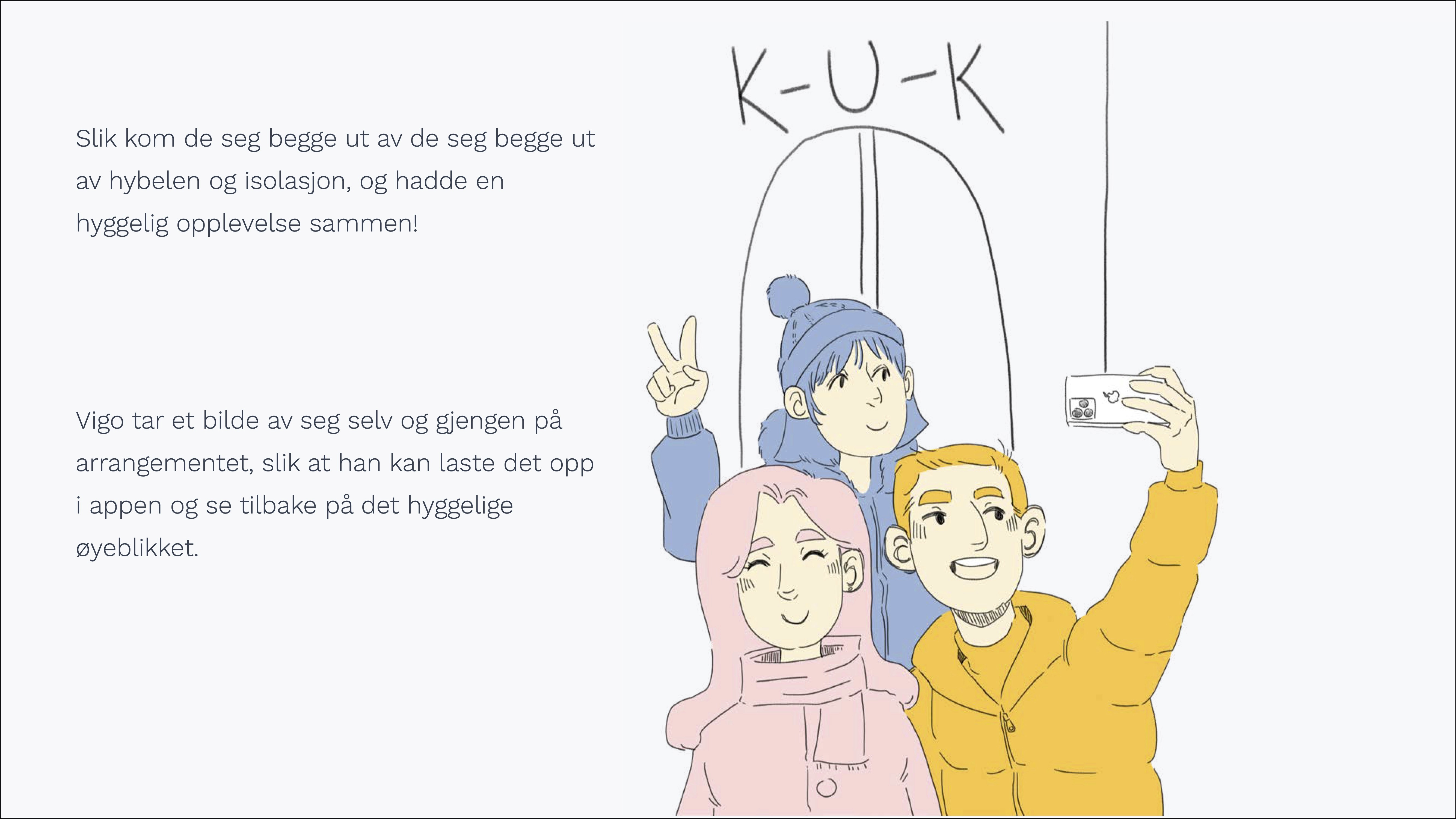 HYGGE - En app som knytter sosiale tilbud i byen sammen på ett sted, og som oppfordrer til sosialisering ved å invitere med seg venner på aktiviteter. Ved å invitere med seg venner stiller man krav til brukeren om å møte opp, og dermed aktivisere seg under de mørke vintermånedene.