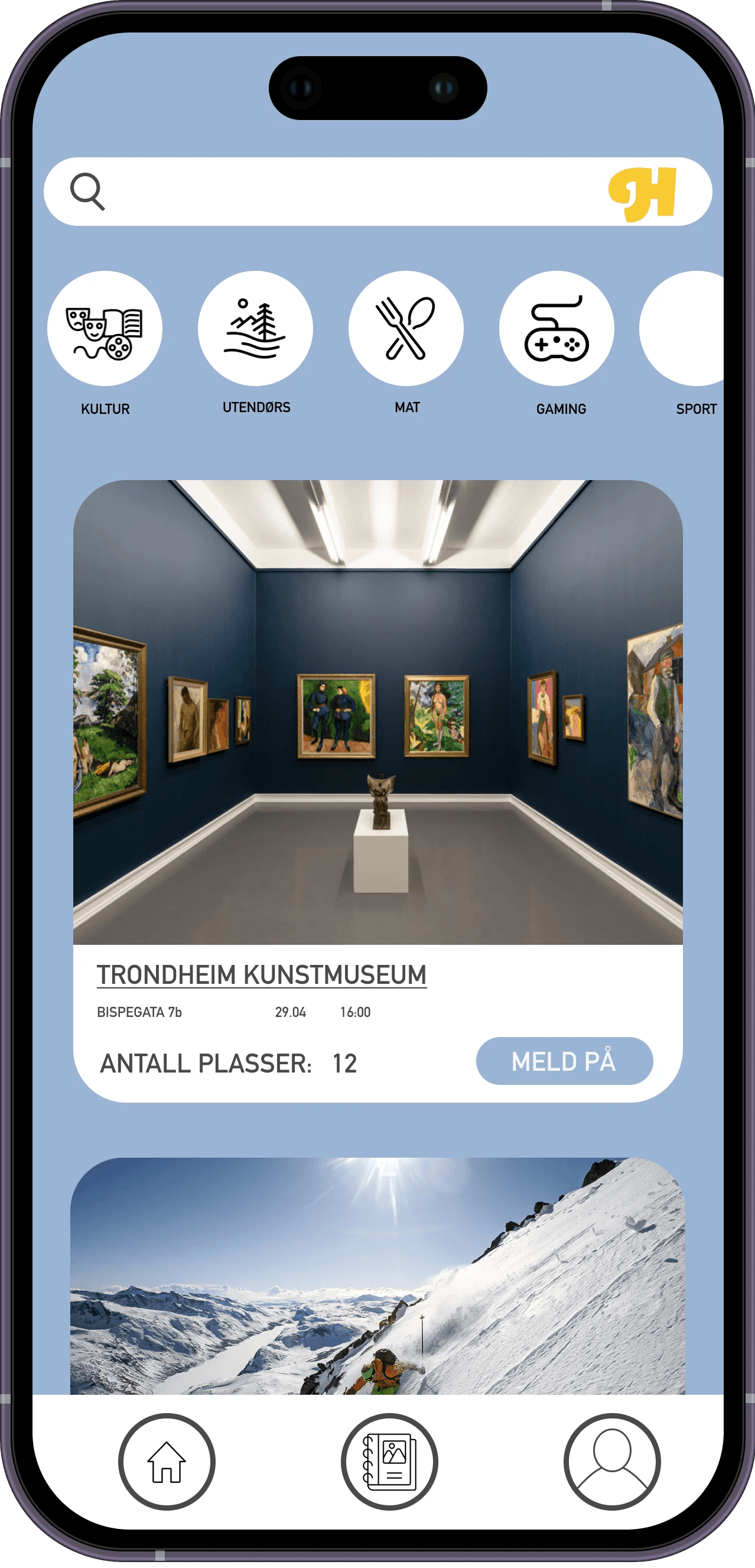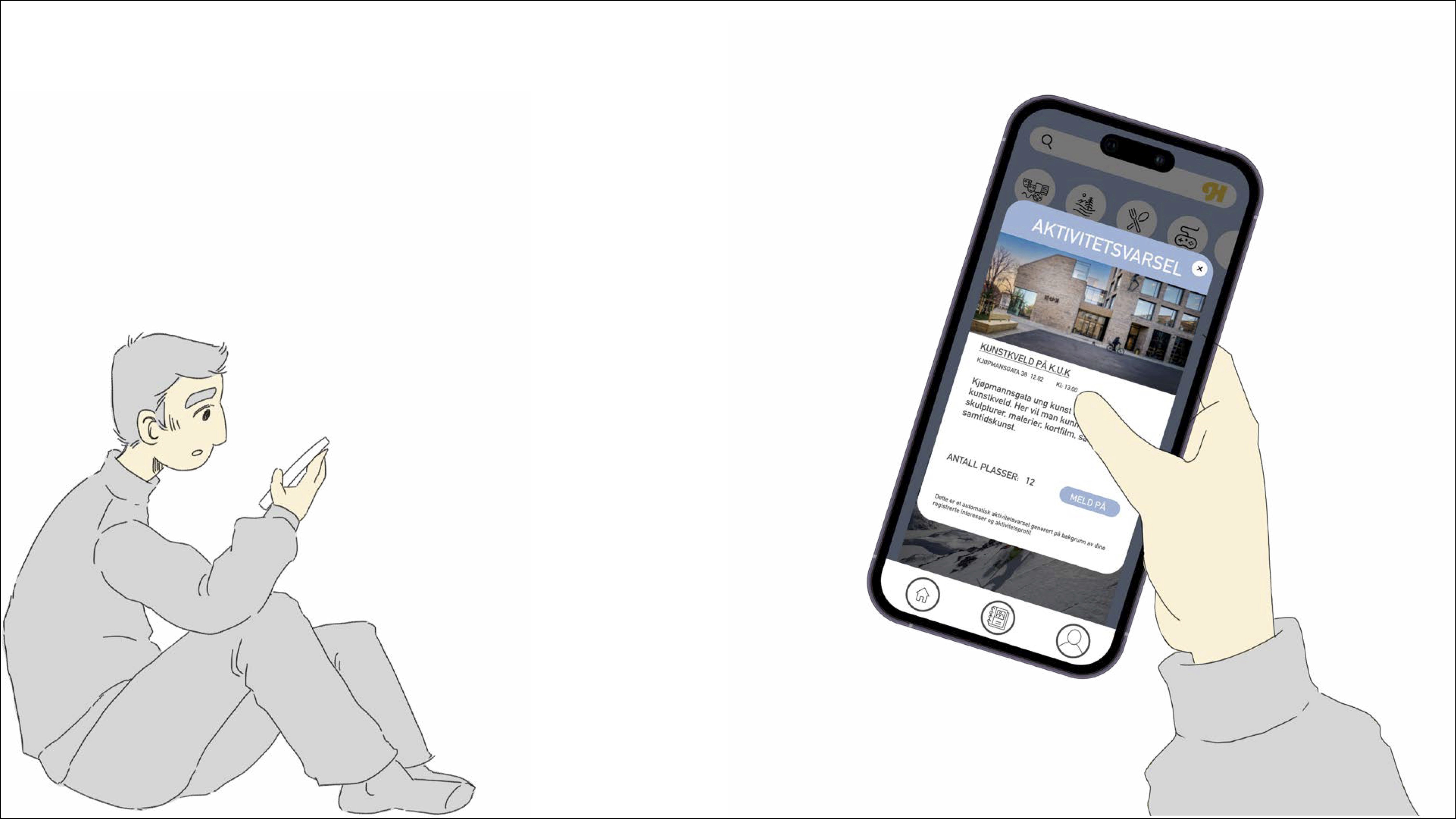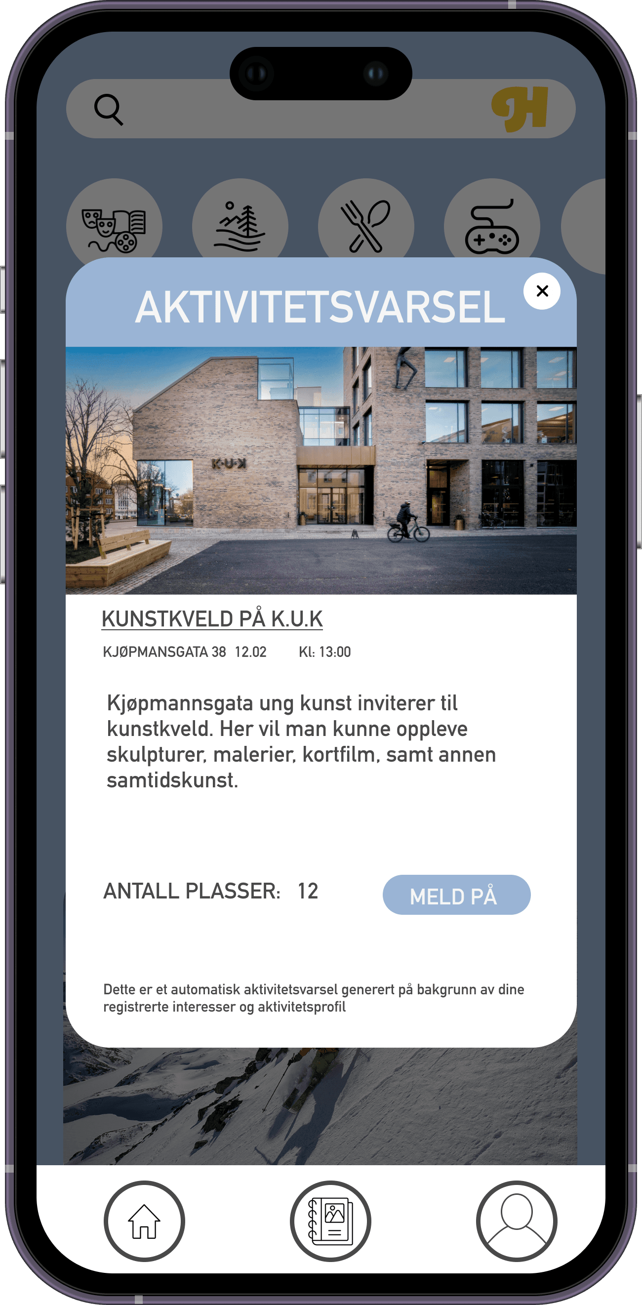 Aktivitetsvarsel i appen. Her kan brukeren melde seg på aktivitetsforslaget fra appen