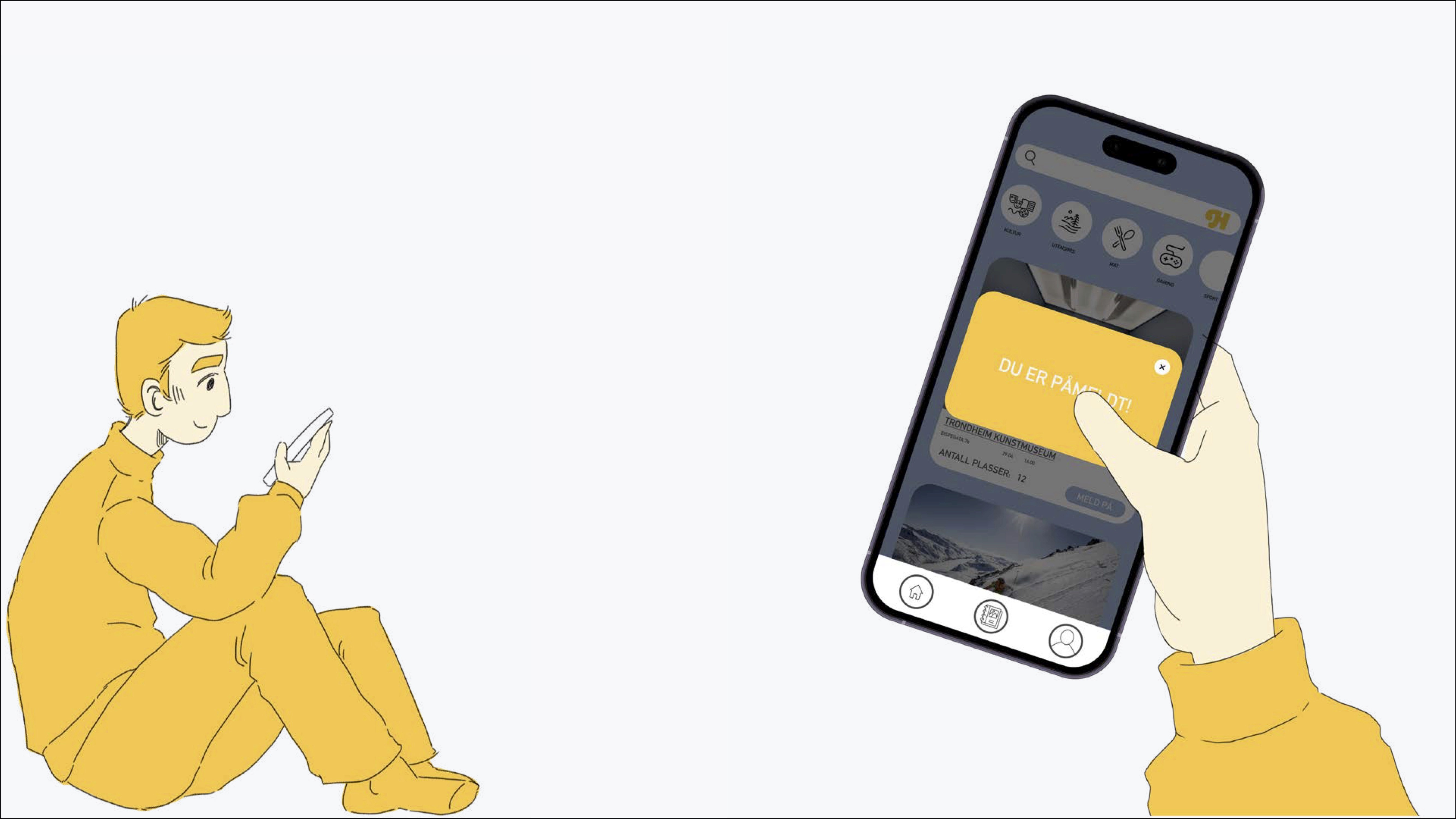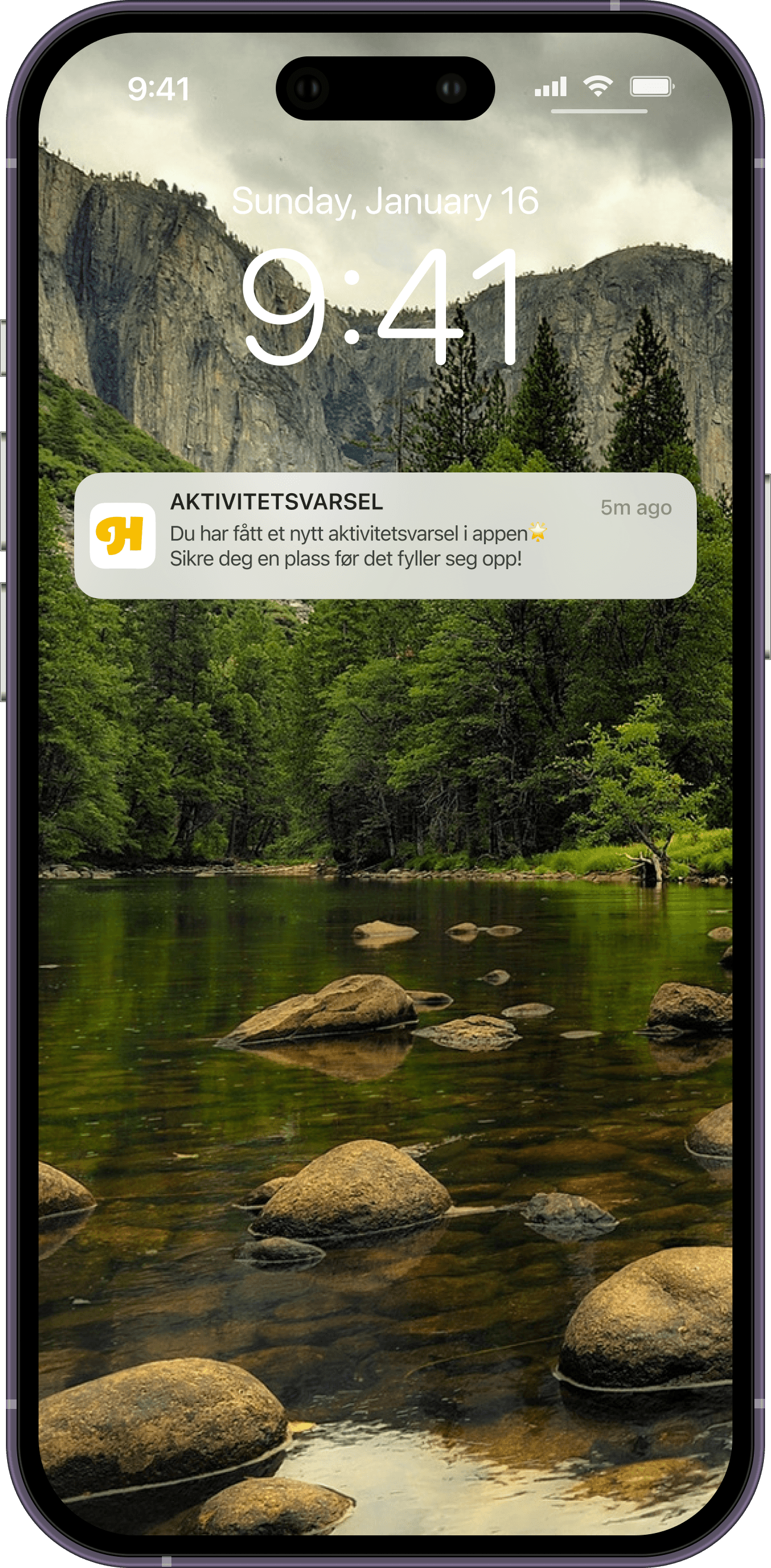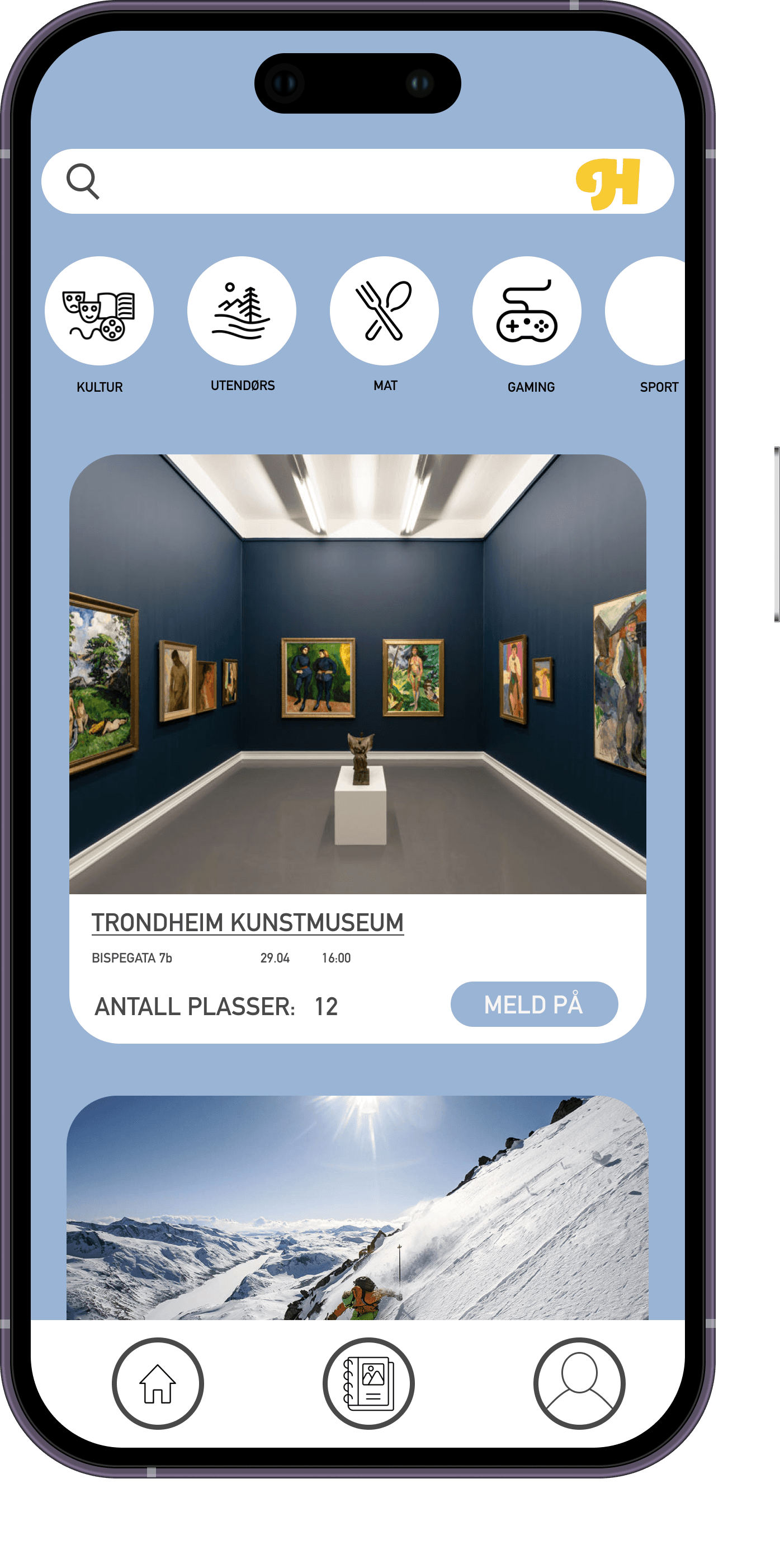 Aktivitetsvarsel i appen. Her kan brukeren melde seg på aktivitetsforslaget fra appen