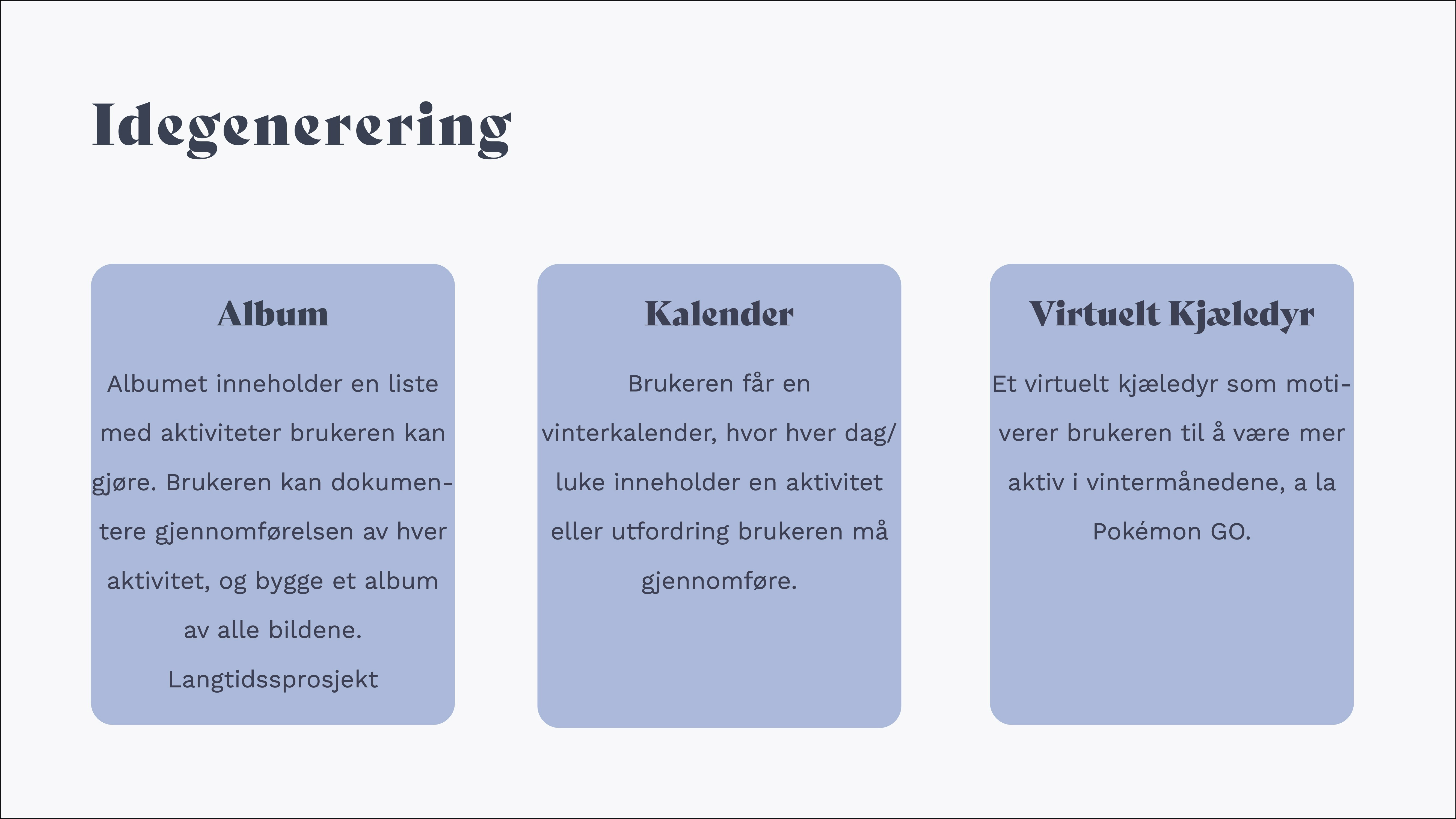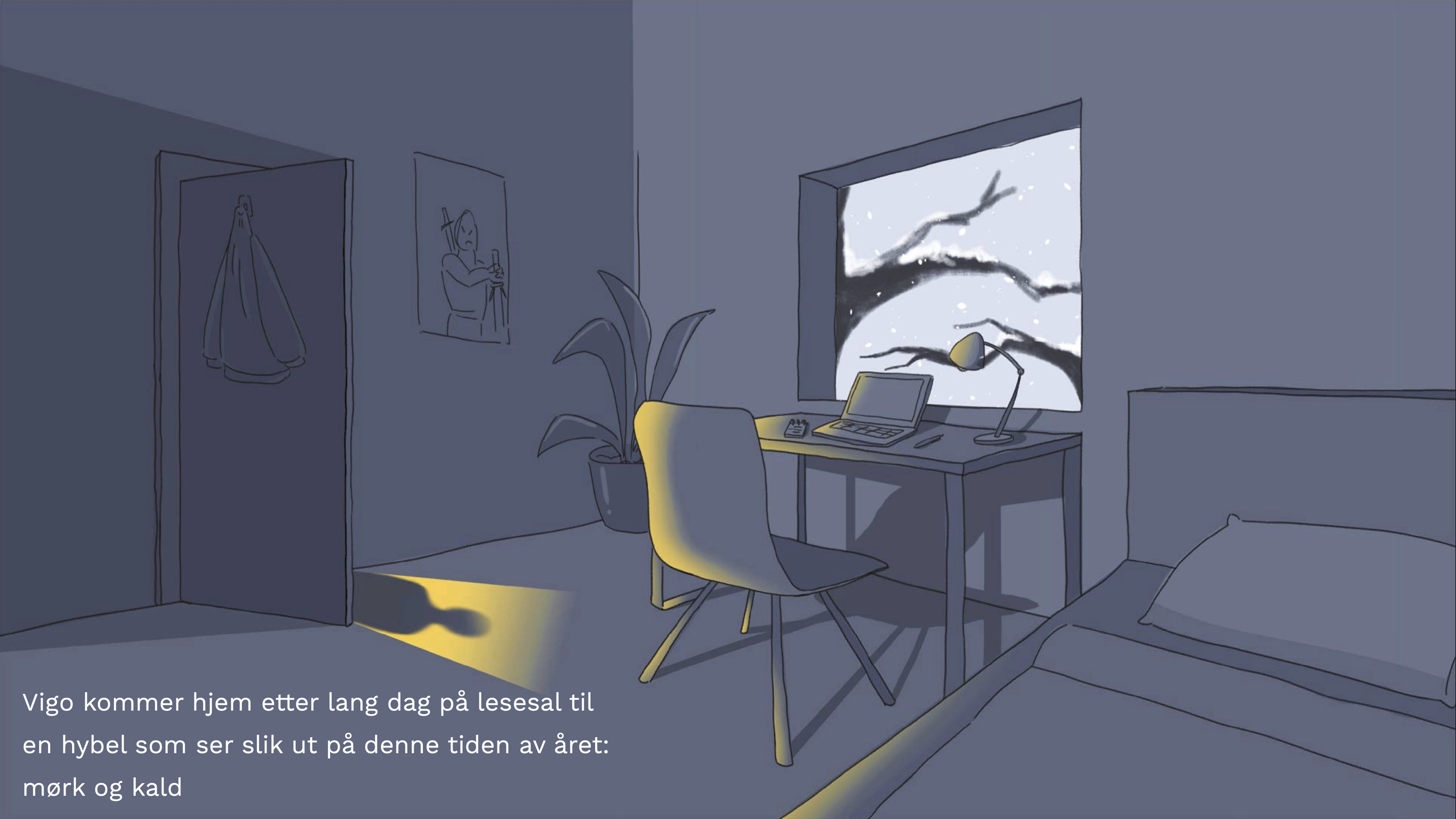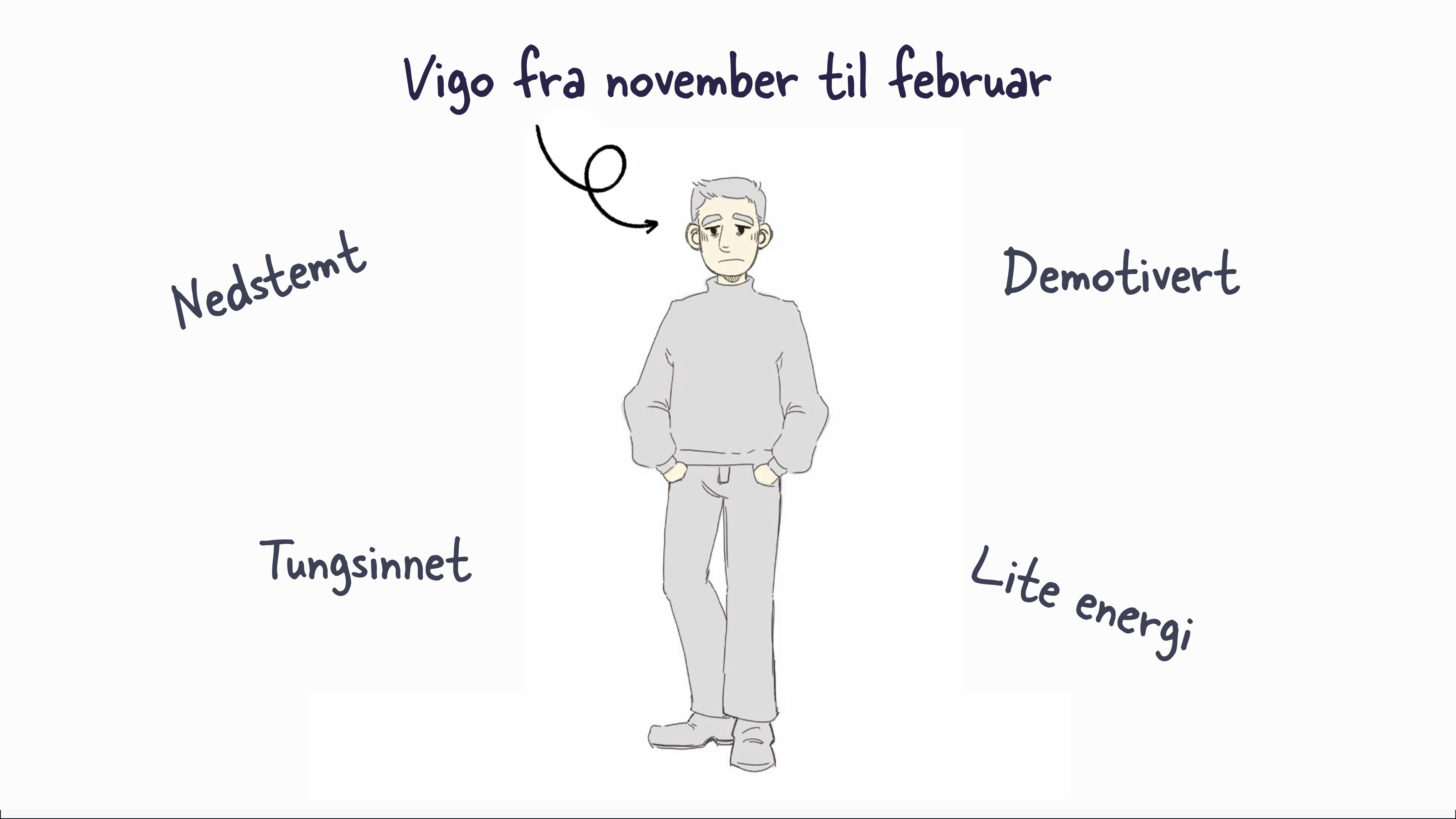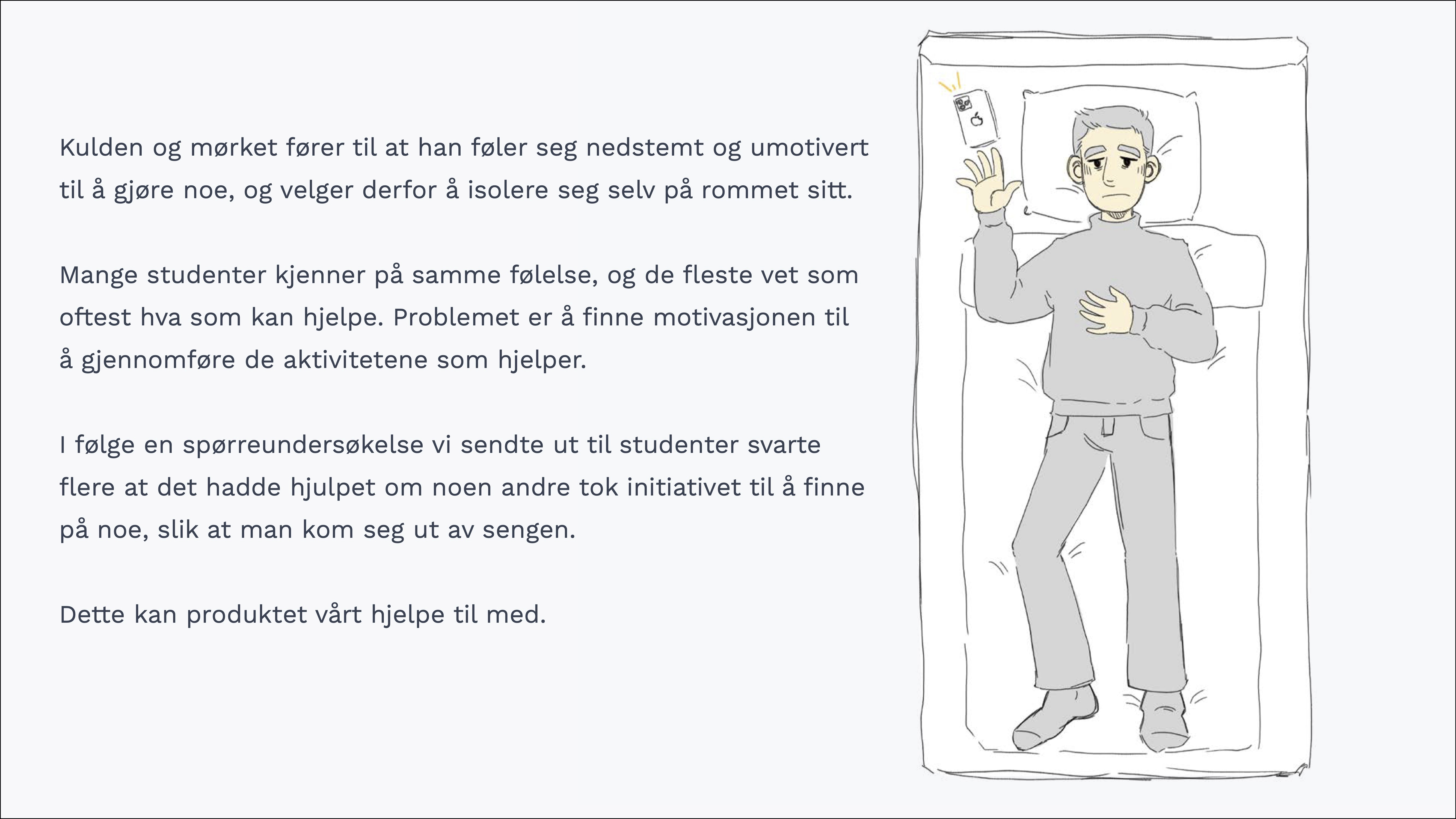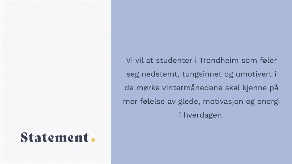 I dette gruppeprosjektet skulle vi lage en tjeneste ut ifra en problemstilling innenfor et valgfritt domene. Vårt valg falt på domenet "Studenter og mental helse" og vi valgte problemstillingen "Hvordan hjelpe studenter med vinterdepresjon". Det er et kjent problem at de mørke vintermånedene kan gjøre studenter mer nedstemt, mindre motivert, og mer asosiale. Gjennom intervjuer med studenter kom det fram at over halvparten av de intervjuede hadde følt på en form for sesongbasert humørpåvirkning. Dette ville vi komme til livs.