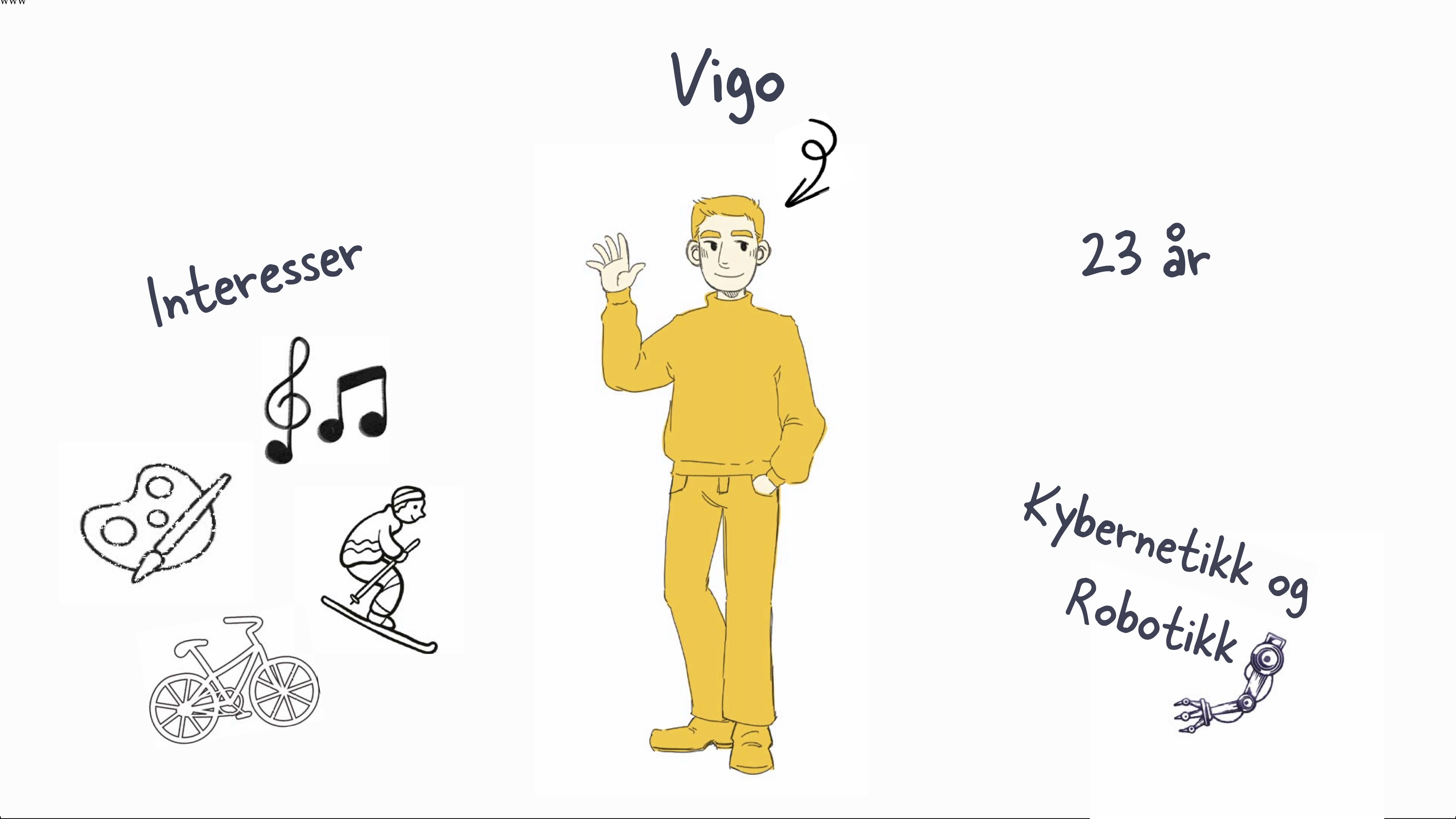 Vi begynte arbeidet med å lage en analogi og en statement basert på problemstillingen vi hadde laget. Med dette som grunnlag begynte vi med intervjuer av brukergruppen vår , studenter, for å kartlegge behov og ønsker. Dataene fra intervjuene ble syntetisert og brukt til å konstruere en persona: Vigo. Dette blir vår kjernebruker i utviklingsprosessen videre. For å supplementere personas´en lagde vi også en animert brukerreise for å vise hvordan tjenesten er tenkt å fungere, tegnet av min dyktige klassekamerat Dana Yerbolat.