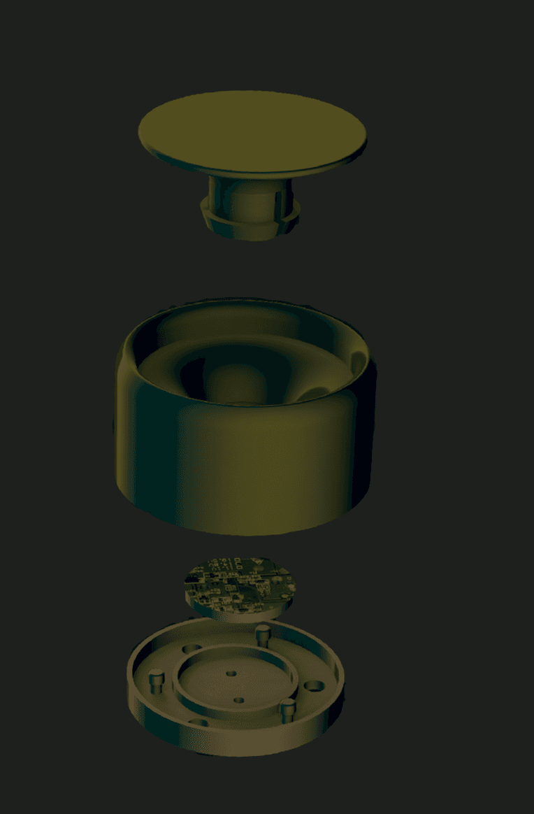 Jeg lot meg inspirere av den haptiske følelsen av toppen til en termos, og lagde en ringeklokke som festes i veggen ved hjelp av en festeplate med bayonette mekanisme. Knappen er bakbelyst av led-lys, og skaper en "svevende" effekt der knappen virker å henge i luften.